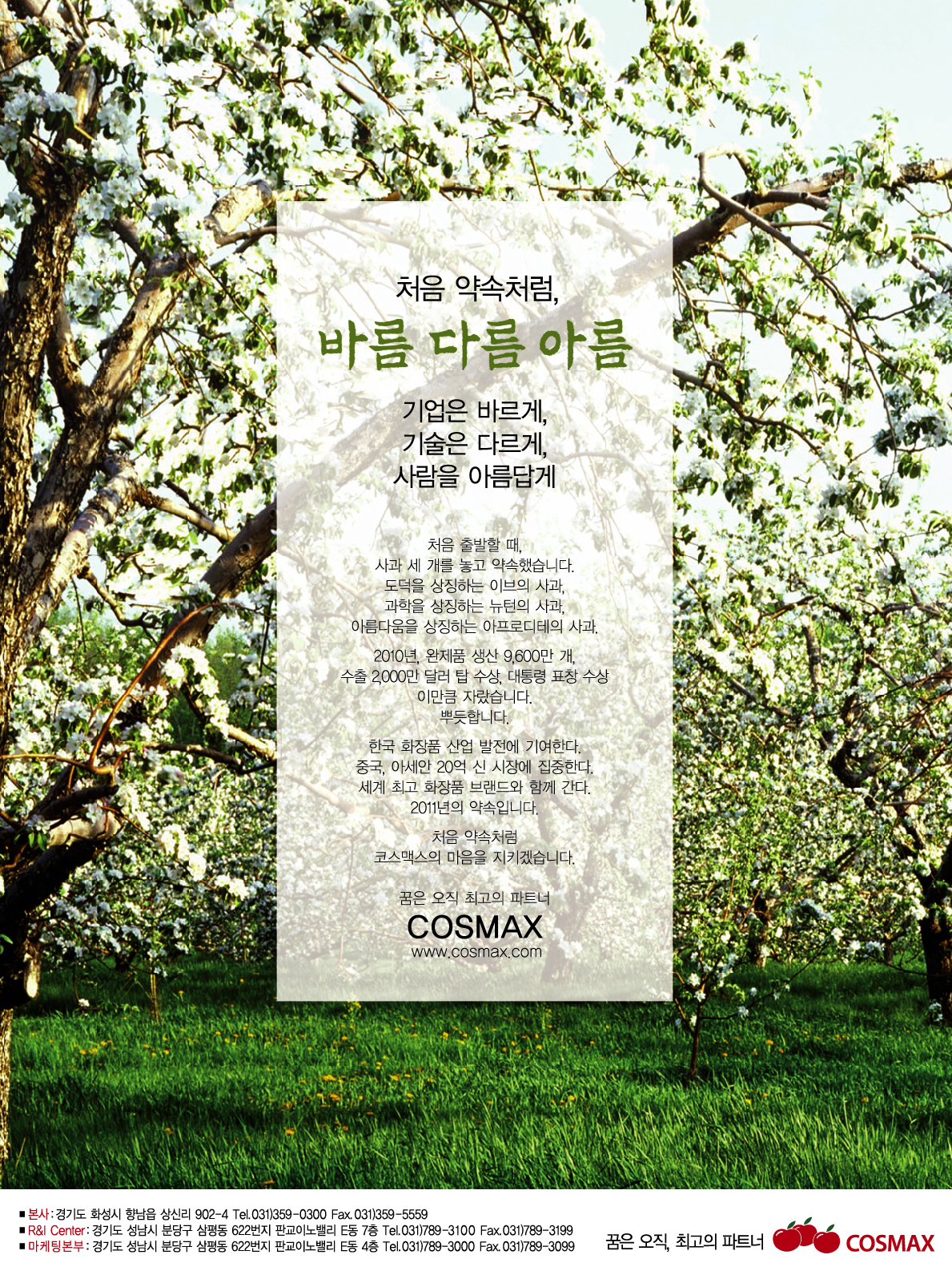 코스맥스 홈페이지는 게시된 이메일 주소가 전자우편 수집프로그램이나 그 밖의 기술적 장치를 이용하여 무단으로 수집되는것을 거부하며, 이를 위반 시 정보통신망법에 의해 형사 처벌됨을 유념하시기 바랍니다.