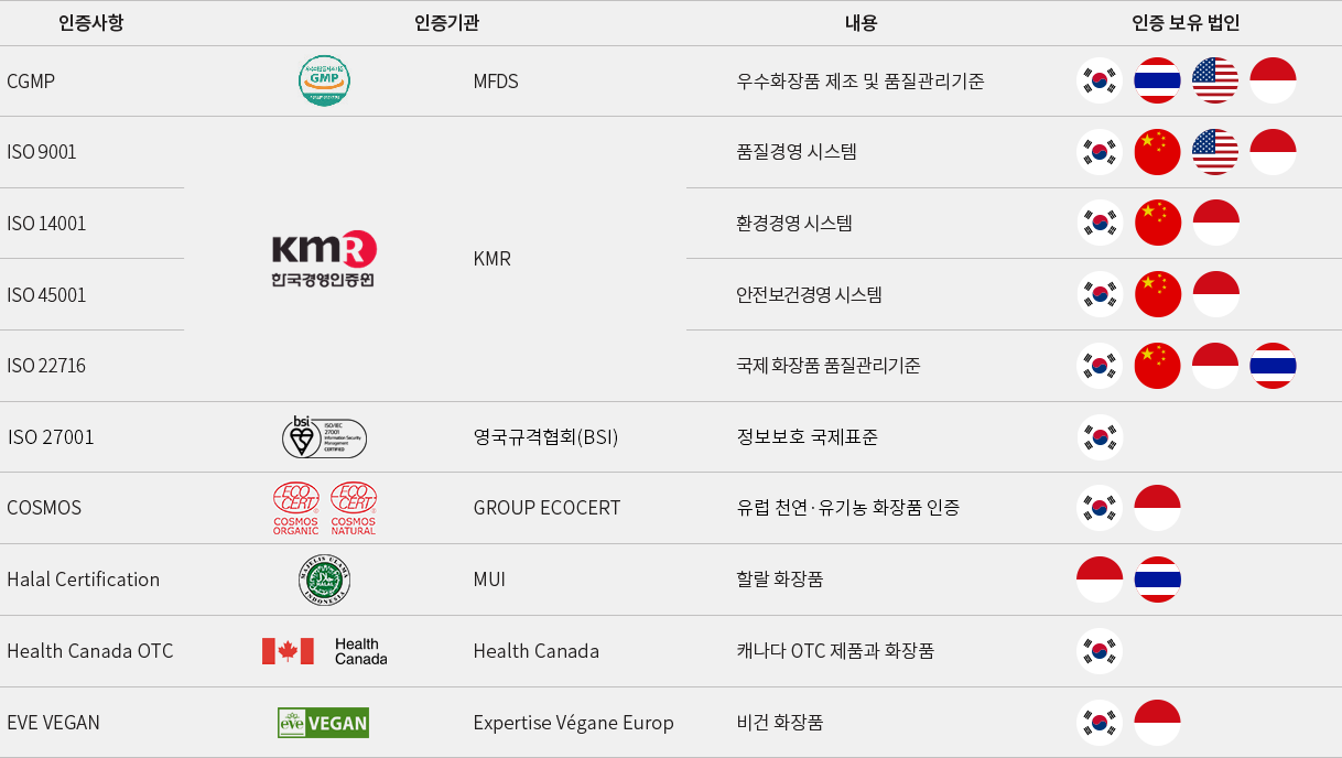 1998년 CGMP 인증을 획득했고, ISO 22716(국제 화장품 GMP), ISO 9001(품질경영), ISO 14001(환경경영), ISO45001(안전보건경영)과 COSMOS(천연·유기농 화장품 인증) 등 화장품 제조 및 품질관리 인증을 모두 획득했습니다. 이어 미국 식품의약국(FDA), 캐나다 보건국(Health Canada)의 화장품 및 일반의약품(OTC) 등록을 국내 업계에서는 유일하게 통과했습니다. 뿐만 아니라 세계 3대 국제 할랄 인증인 MUI 인증, 프랑스 인증기관 EVE로부터 비건 화장품 생산 인증 등을 획득하여 각 국가별 필수요건을 충족시키는 초일류 품질을 자랑하는 기업임을 증명했습니다. 또 로레알, 존슨앤존슨, 메리케이와 같은 글로벌 기업과의 정기적인 현장실사(Audit)를 통한 최상의 글로벌 품질 시스템을 유지관리하고 있습니다.